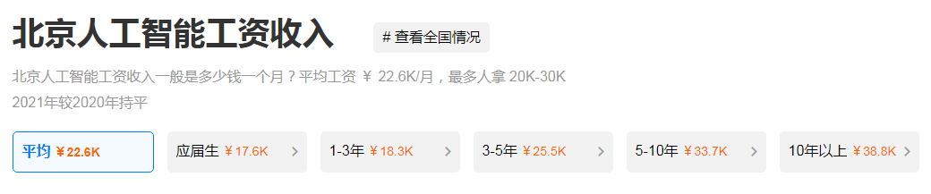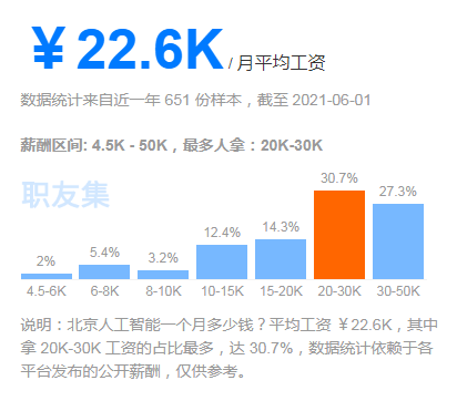 根据职友集数据显示,北京地区人工智能岗位的平均薪资可高达22.6K/月,并且随着工作经验的积累,工资水平也在不断上涨。