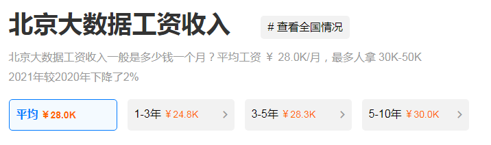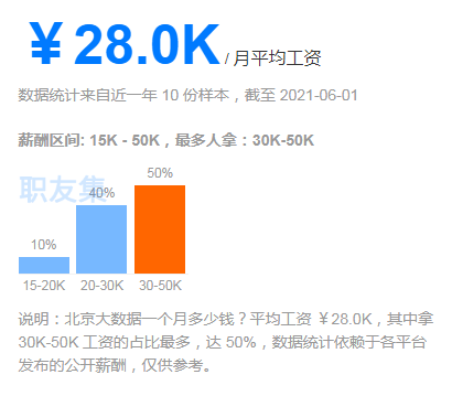 IT技术领域薪资一直是普遍偏高的,而IT技术中,大数据的薪资也一直居高不下,就北京地区的大数据岗位平均薪资就可以达到28K/月。